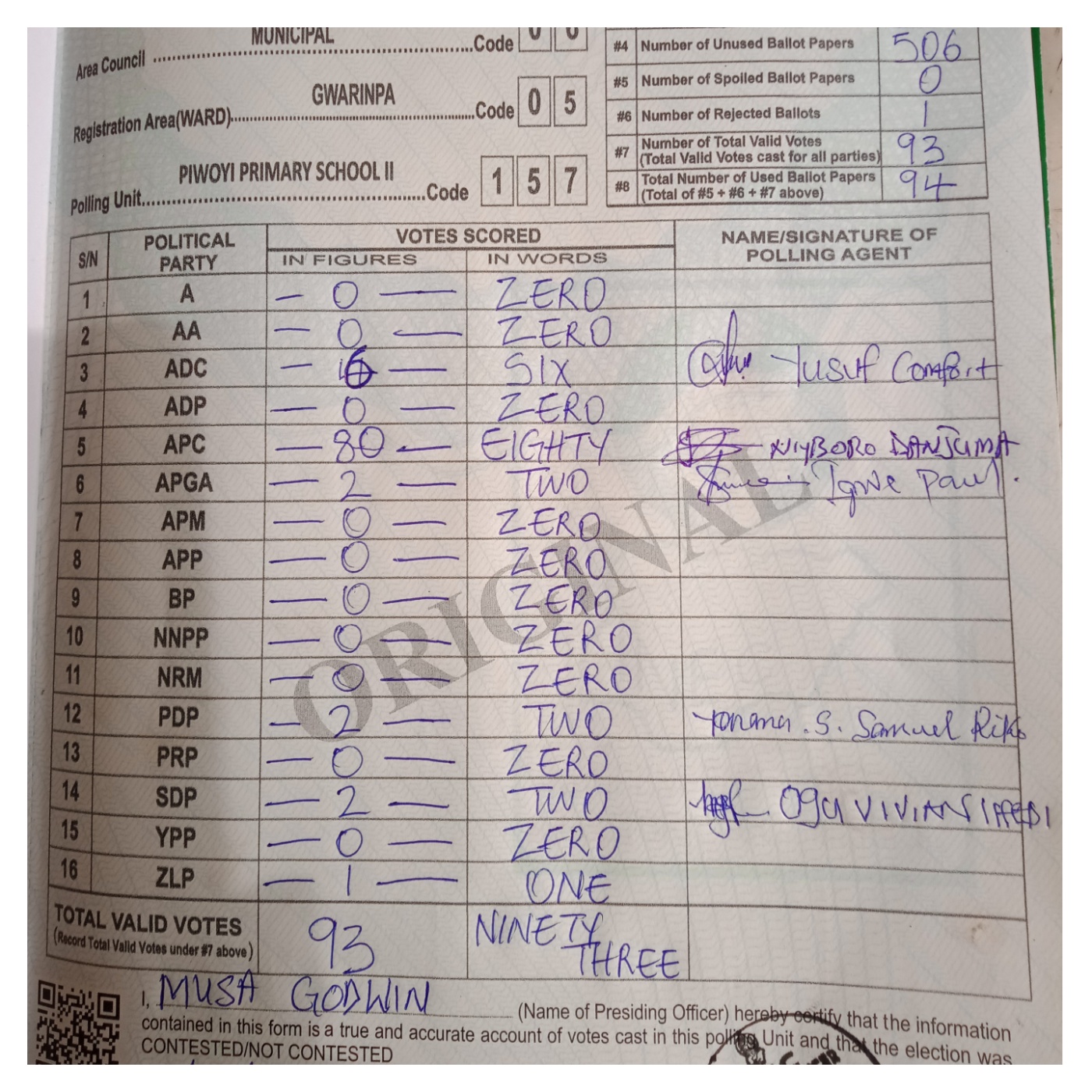 DAILY POST reports that APC won the chairmanship poll in the polling unit with 80 votes. ADC scored six votes while PDP got two votes.